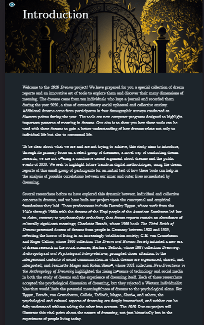 A digital humanities project exploring dreaming in 2020 in light of the pandemic and other significant events of that year.